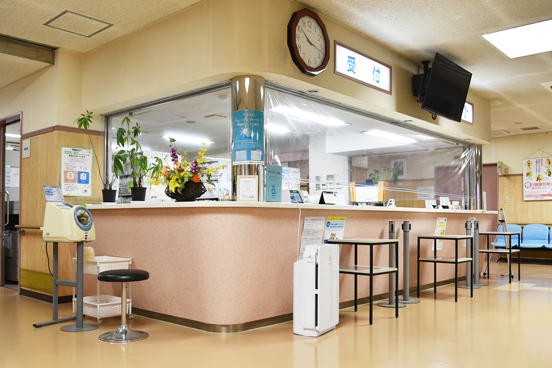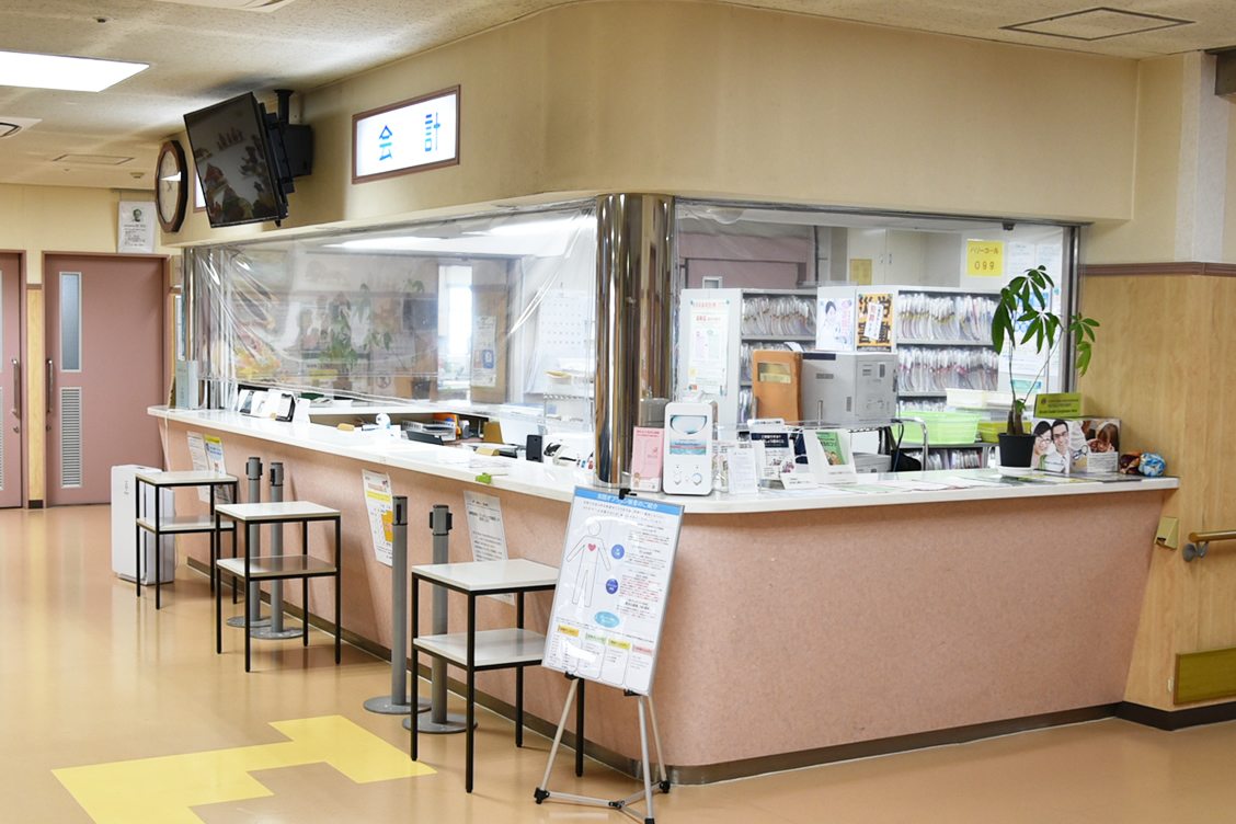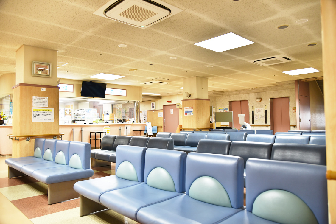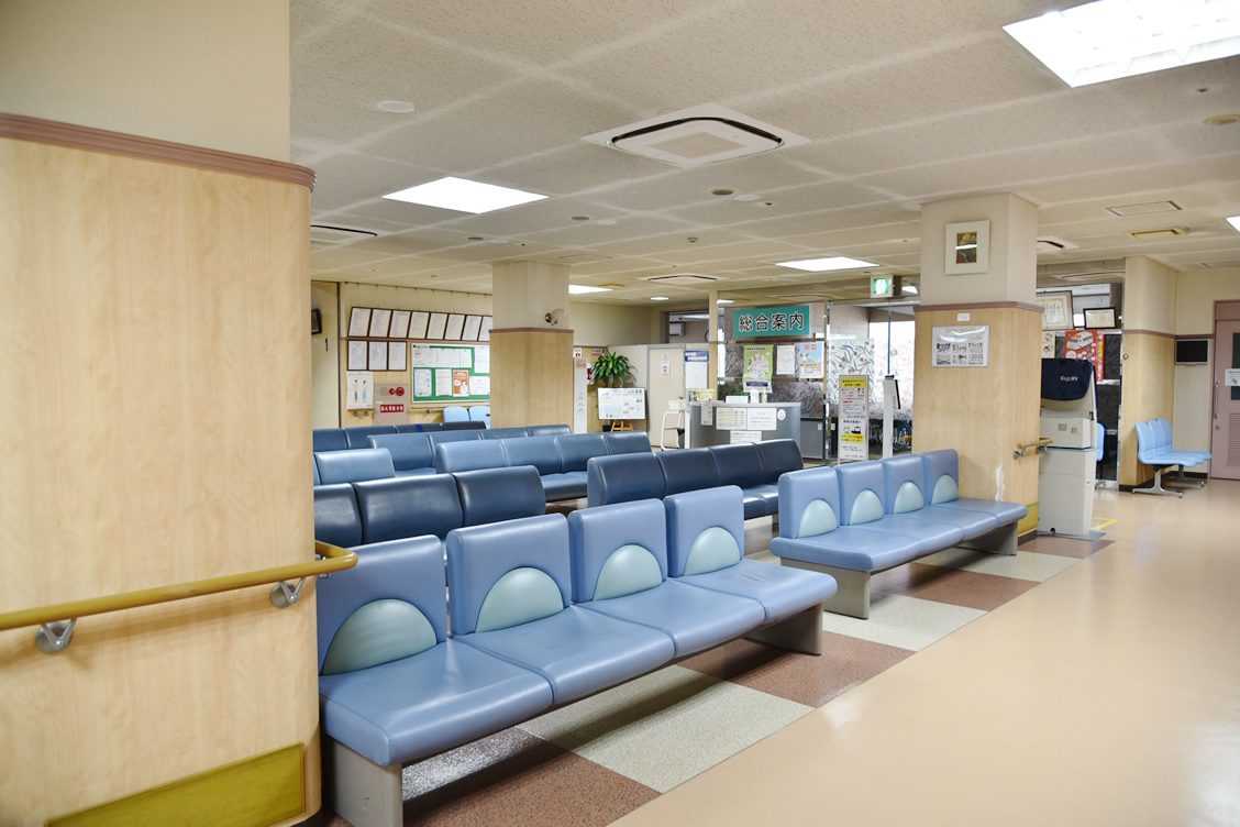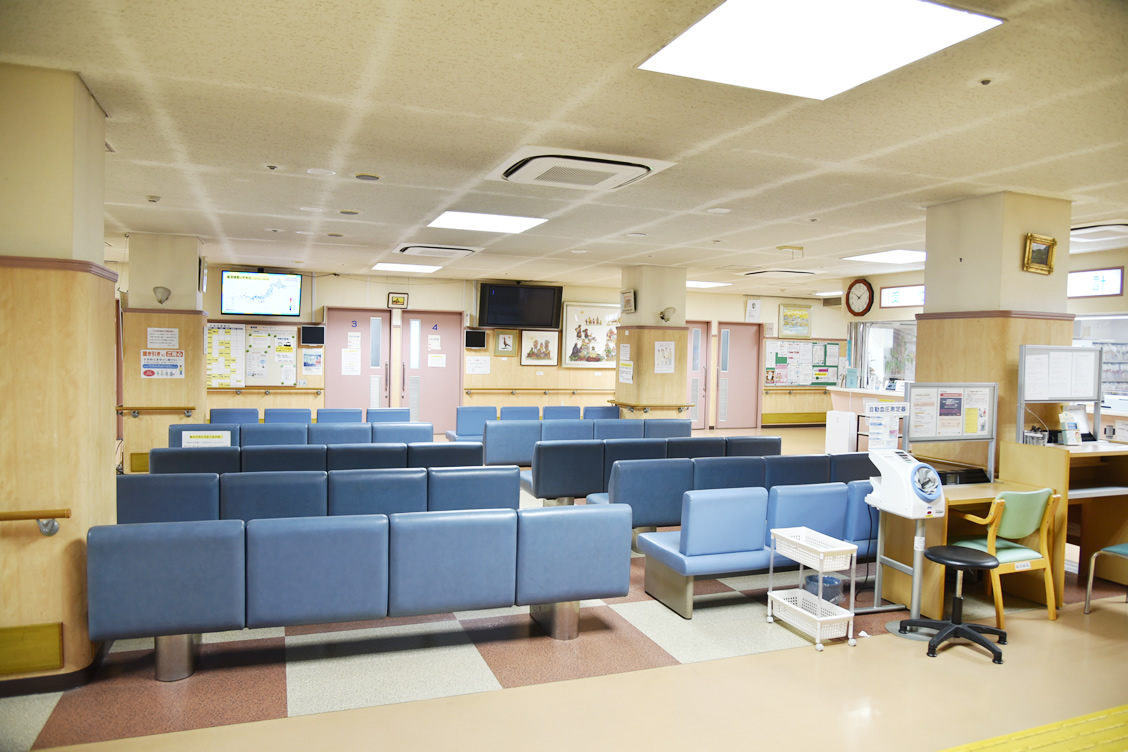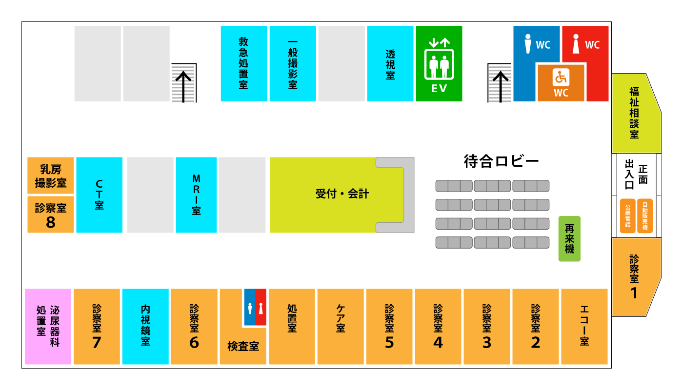 1階は外来診察のフロアとなっております。正面玄関を入ると待合ロビーがあり、正面に受付・会計窓口があります。1番から8番までの診察室があり、症状・診療科に応じて該当する診察室へお呼び致します。また、レントゲン・CT・MRI・エコー・内視鏡・心電図の各種検査室があり、検査内容に応じてご案内致します。正面玄関を入ってすぐ右には医療福祉相談室があり、医療や福祉に関する相談に応じます