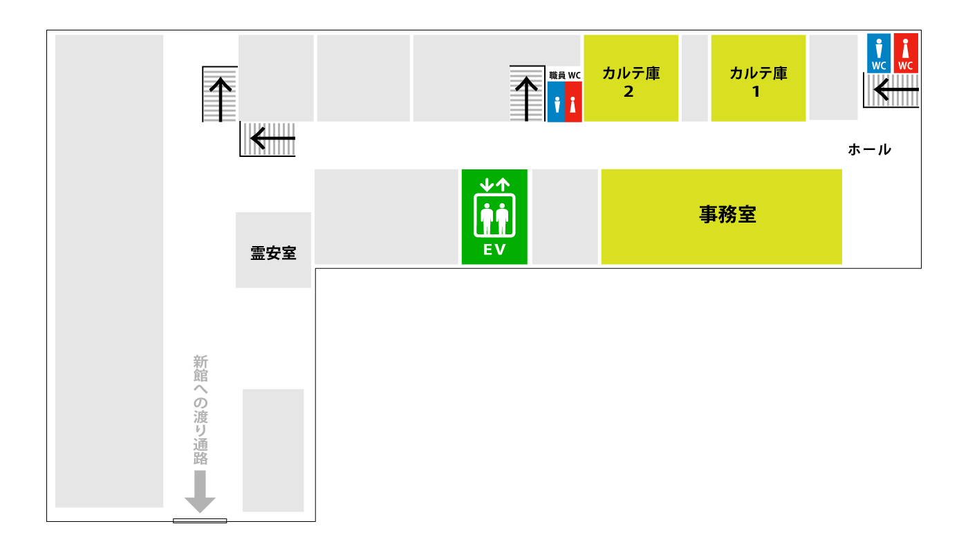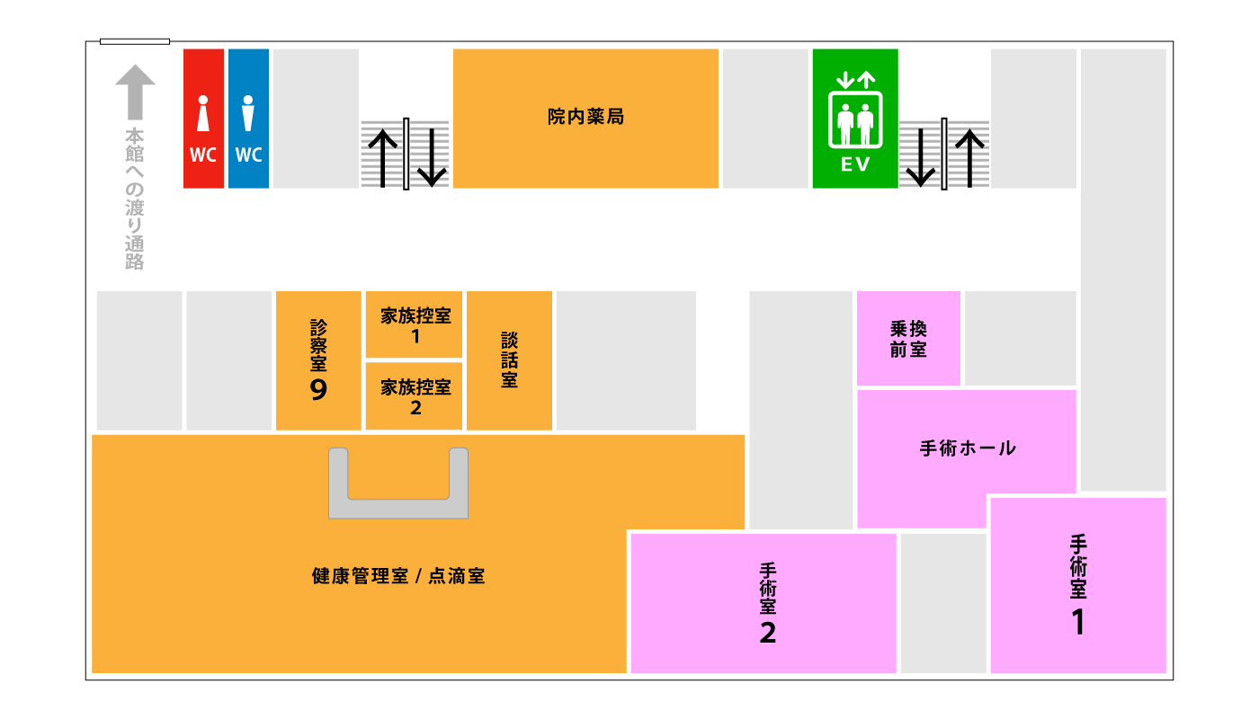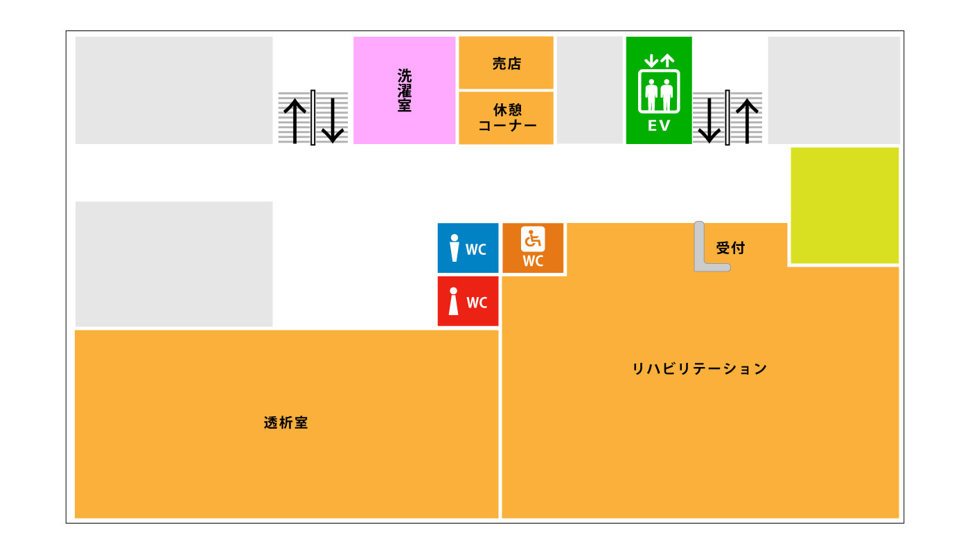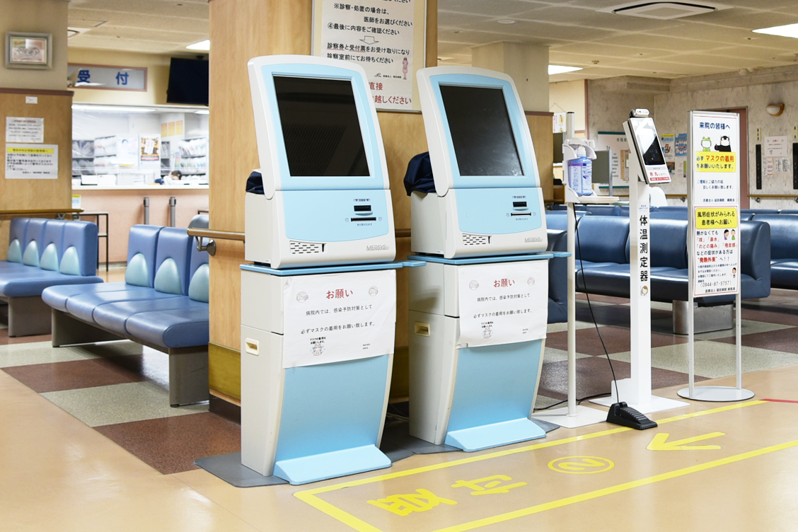 1階は外来診察のフロアとなっております。正面玄関を入ると待合ロビーがあり、正面に受付・会計窓口があります。1番から8番までの診察室があり、症状・診療科に応じて該当する診察室へお呼び致します。また、レントゲン・CT・MRI・エコー・内視鏡・心電図の各種検査室があり、検査内容に応じてご案内致します。正面玄関を入ってすぐ右には医療福祉相談室があり、医療や福祉に関する相談に応じます