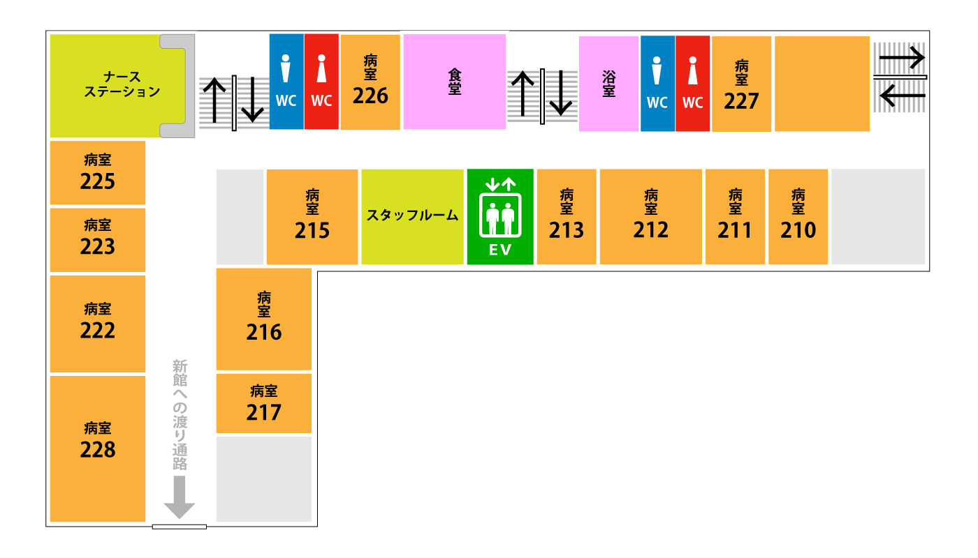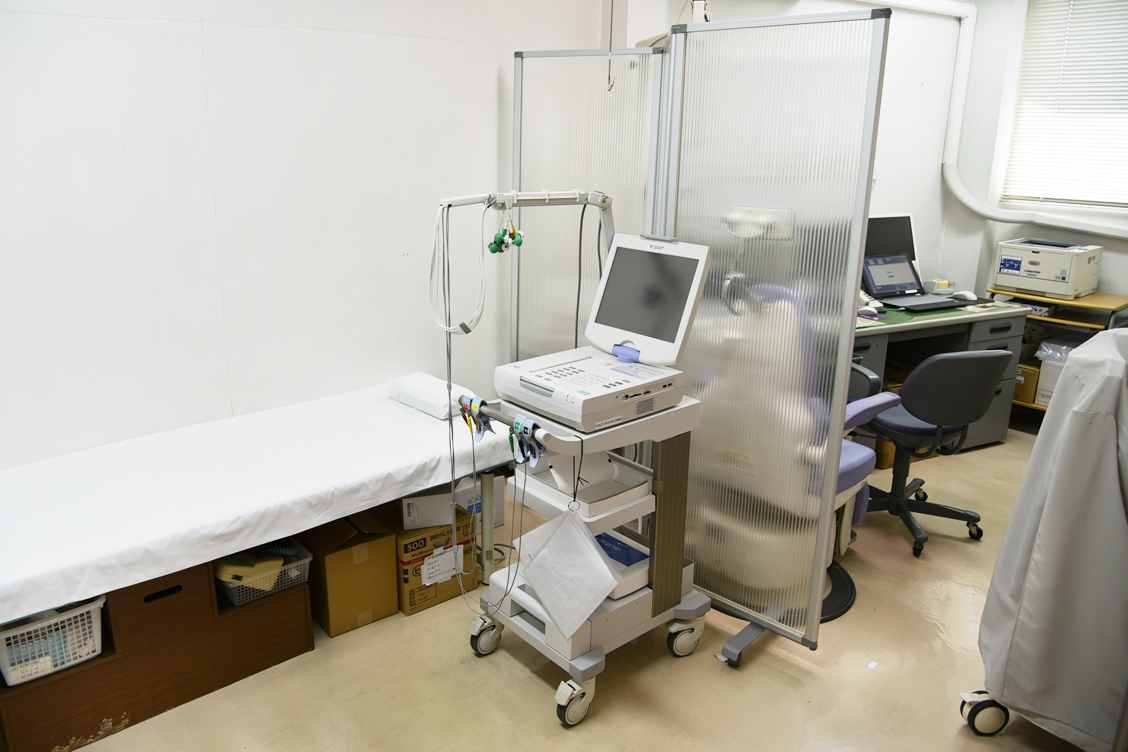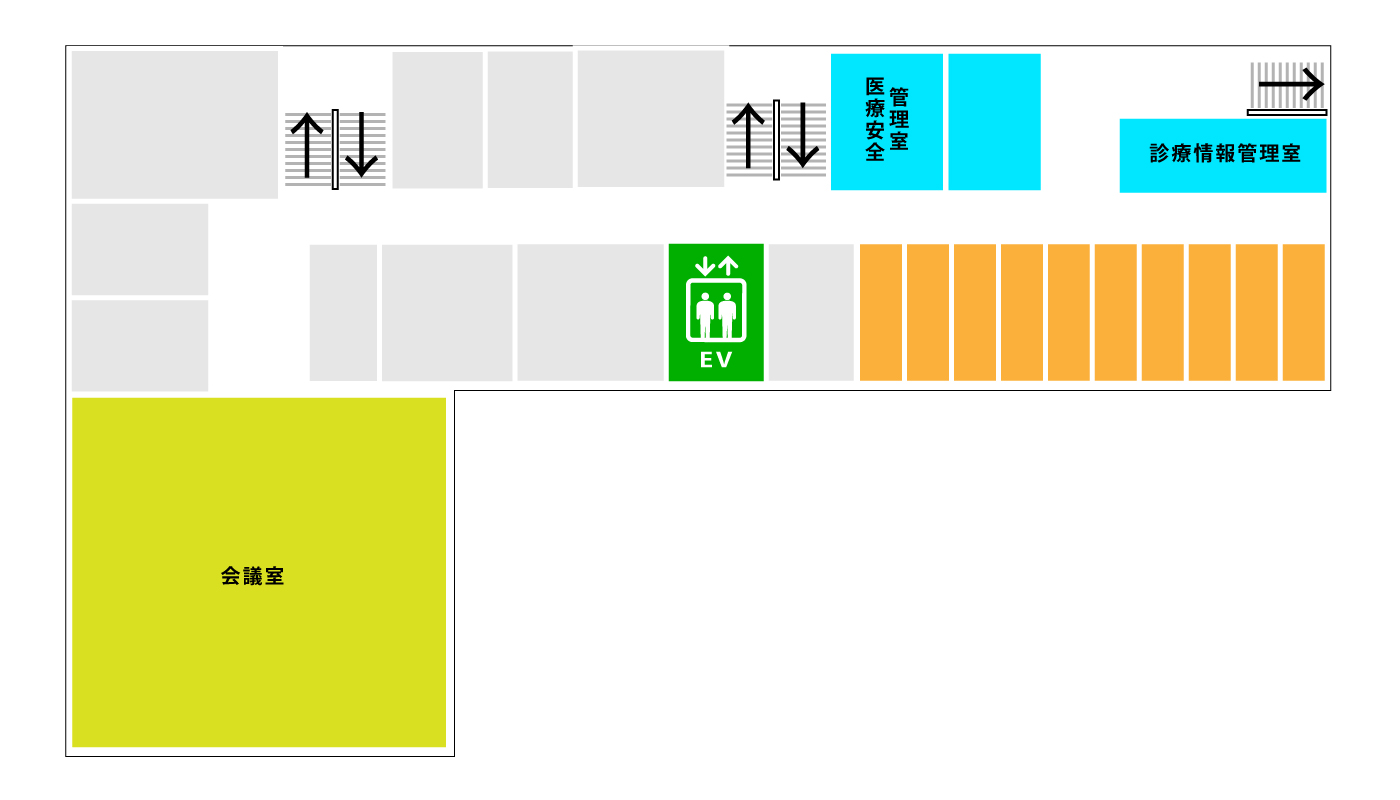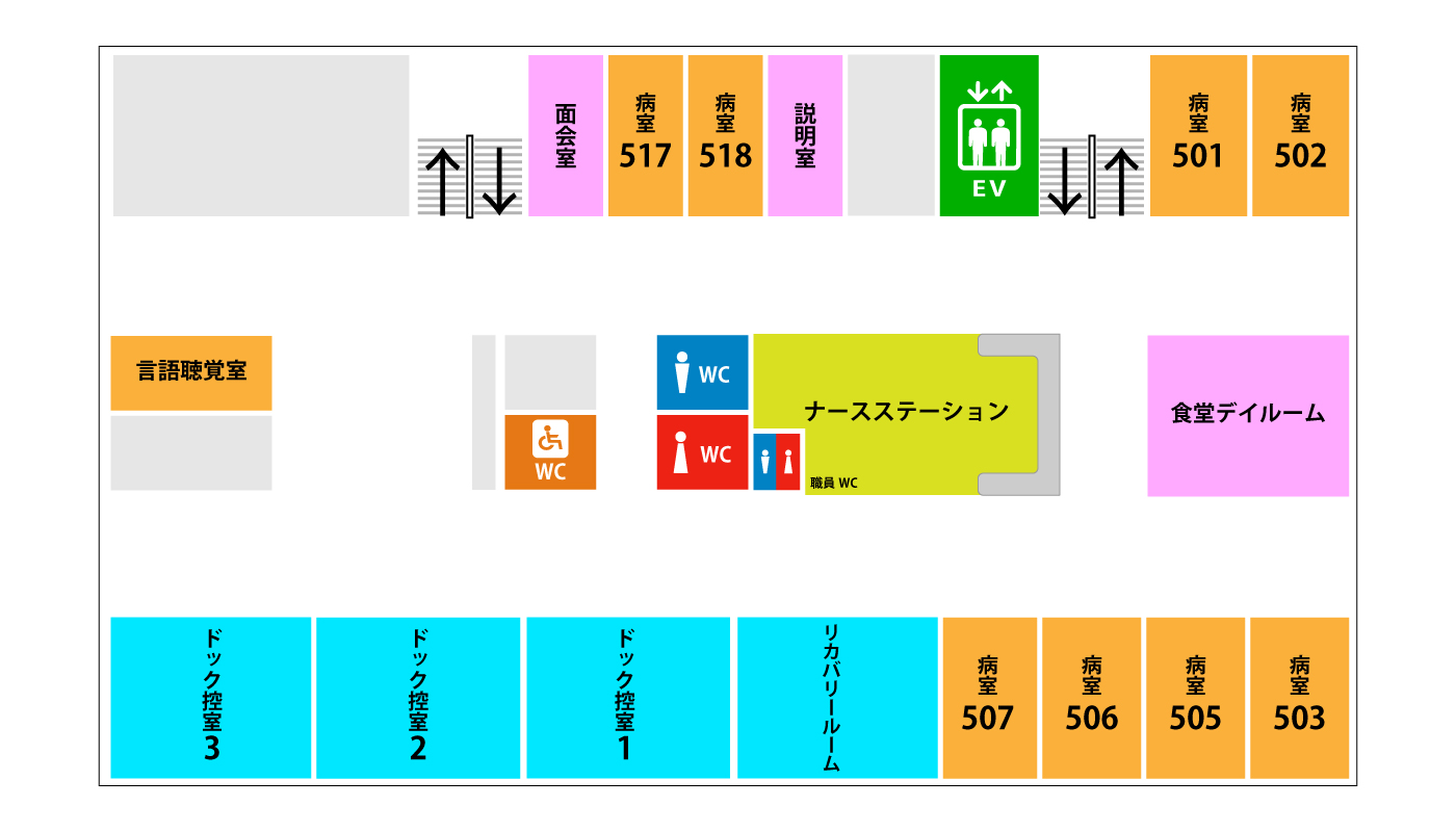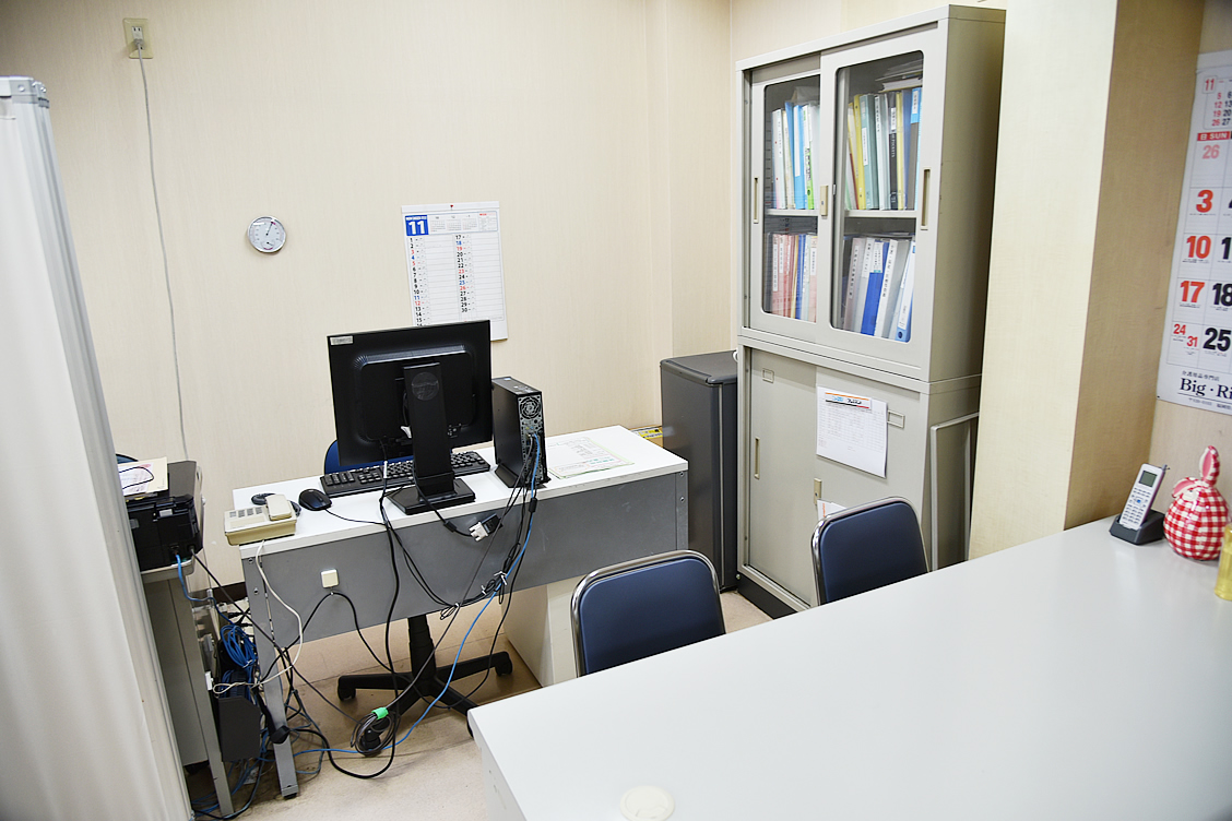 1階は外来診察のフロアとなっております。正面玄関を入ると待合ロビーがあり、正面に受付・会計窓口があります。1番から8番までの診察室があり、症状・診療科に応じて該当する診察室へお呼び致します。また、レントゲン・CT・MRI・エコー・内視鏡・心電図の各種検査室があり、検査内容に応じてご案内致します。正面玄関を入ってすぐ右には医療福祉相談室があり、医療や福祉に関する相談に応じます
