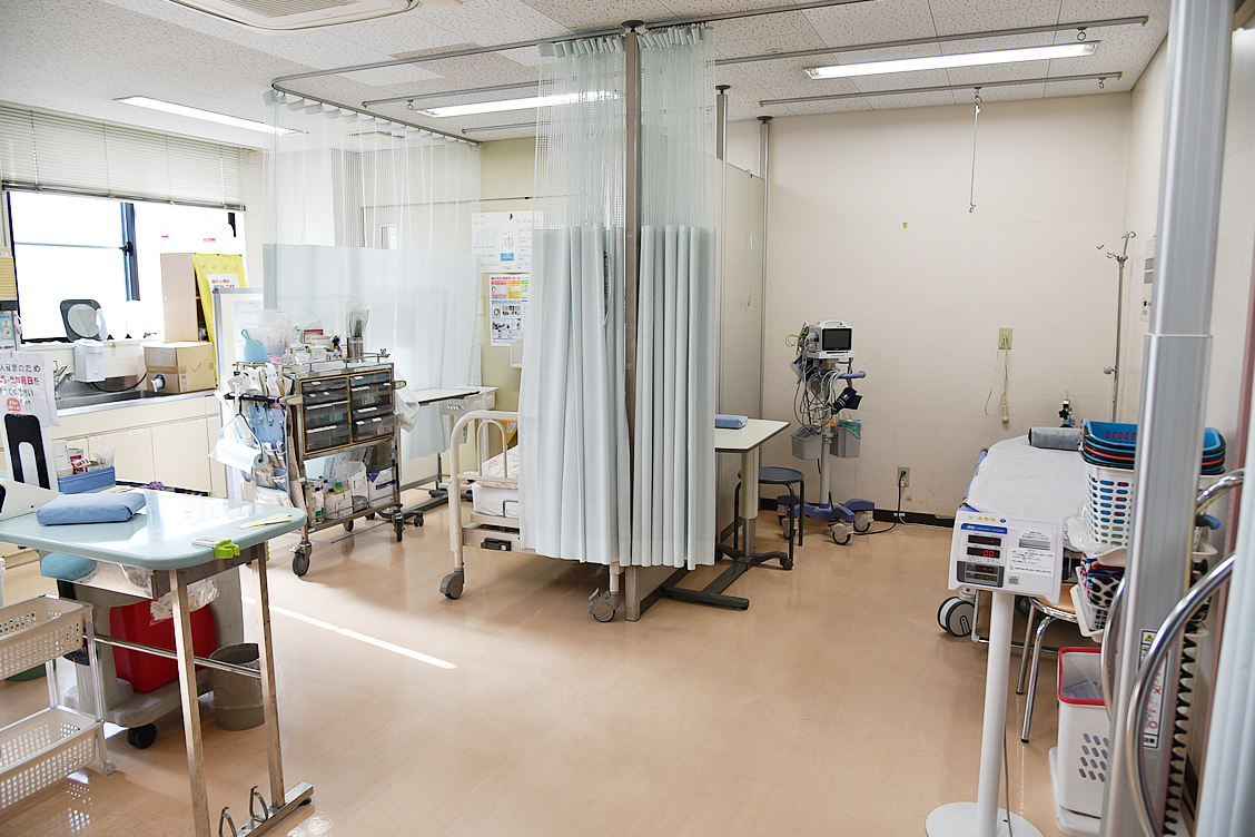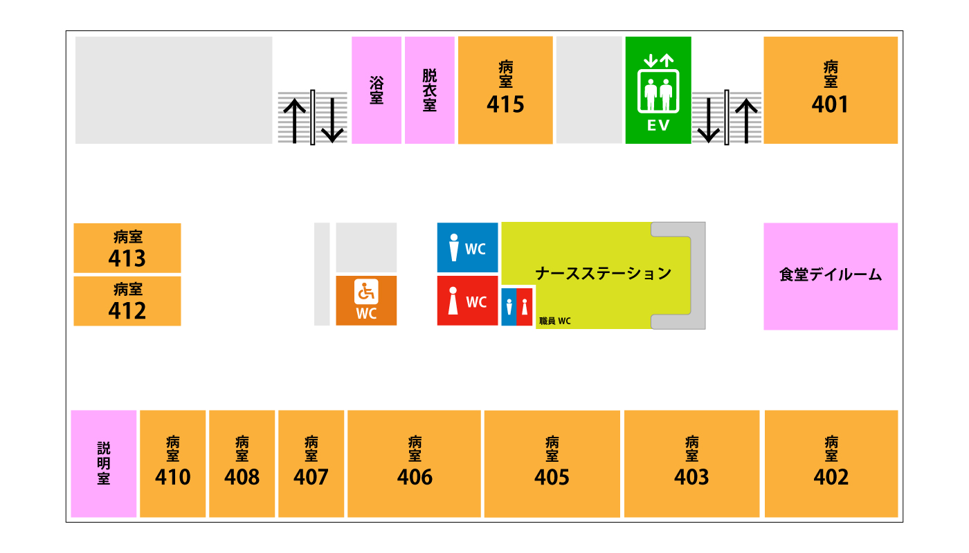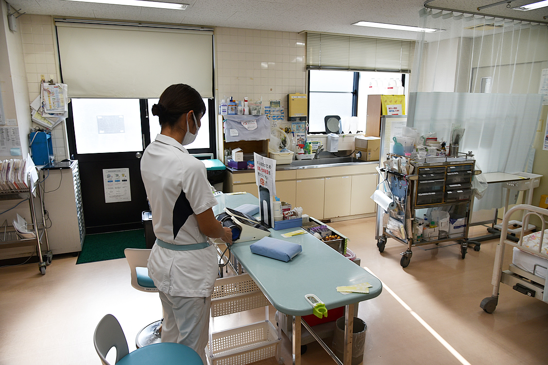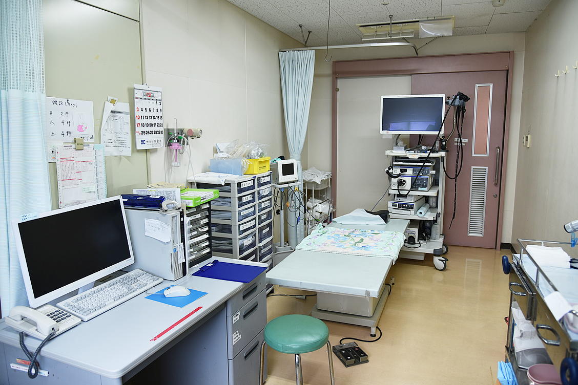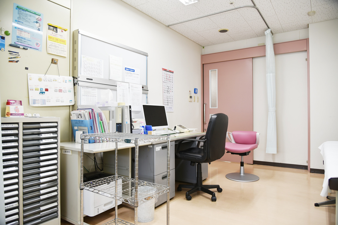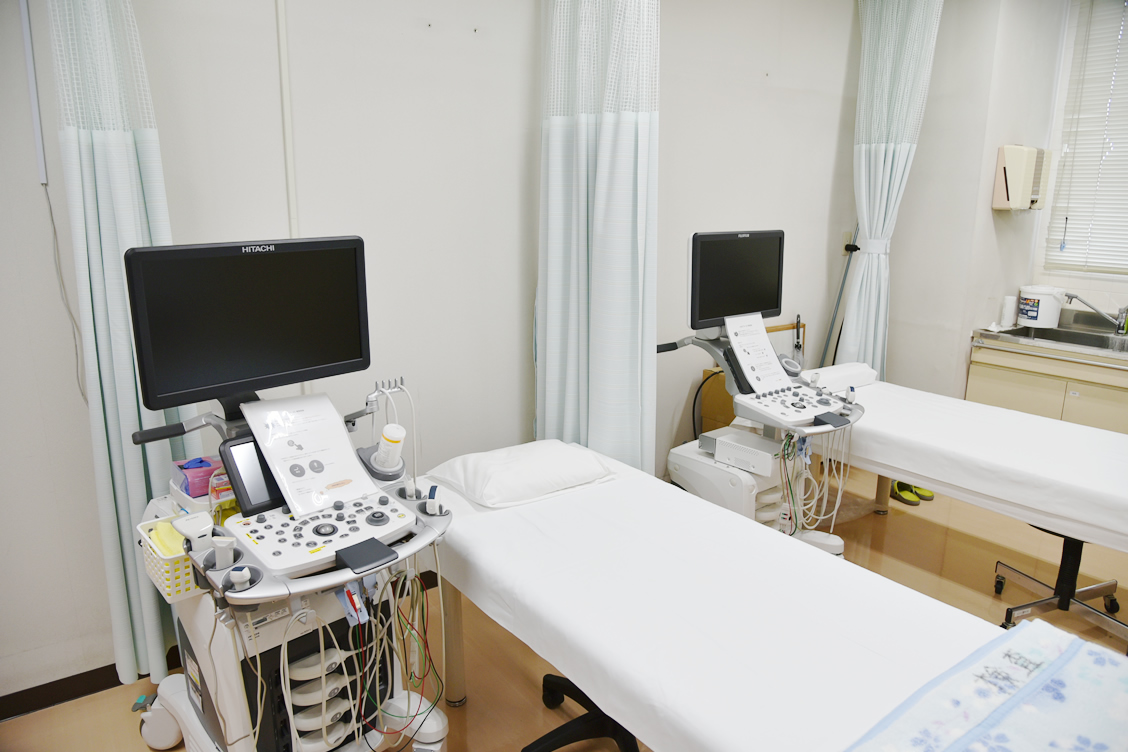 1階は外来診察のフロアとなっております。正面玄関を入ると待合ロビーがあり、正面に受付・会計窓口があります。1番から8番までの診察室があり、症状・診療科に応じて該当する診察室へお呼び致します。また、レントゲン・CT・MRI・エコー・内視鏡・心電図の各種検査室があり、検査内容に応じてご案内致します。正面玄関を入ってすぐ右には医療福祉相談室があり、医療や福祉に関する相談に応じます